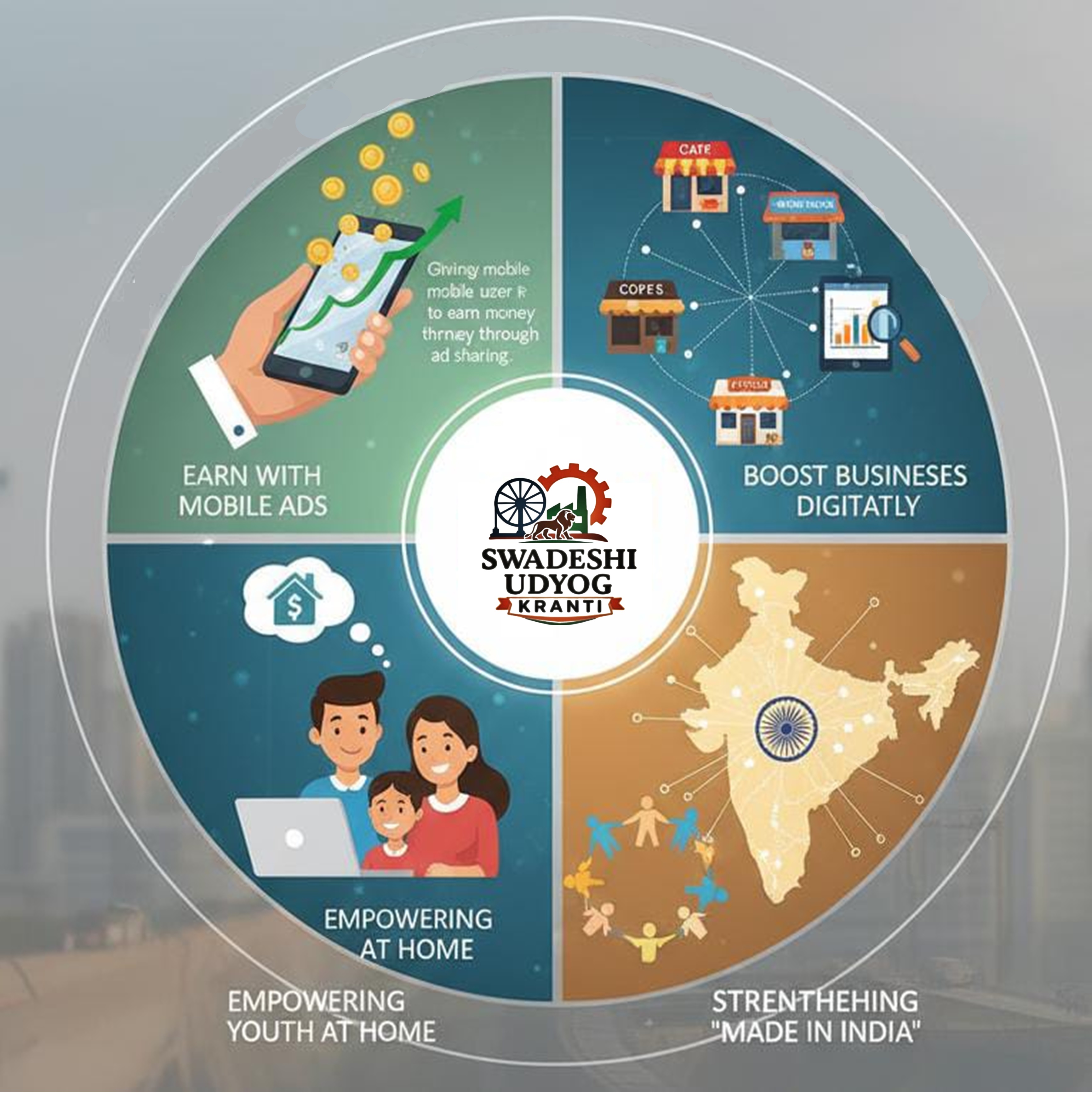 Swadeshi Udyog Kranti is an innovative initiative launched in India to empower ordinary citizens through digital empowerment. Our goal is to provide every Indian with the opportunity to earn money through their mobile phones, enabling them to utilize their time effectively and become financially strong without leaving their homes. Just like the name suggests, Swadeshi Udyog Kranti, our mission is to bring about a revolution in the fields of industry, employment, and advertising in India, enabling every citizen to become self-reliant.
